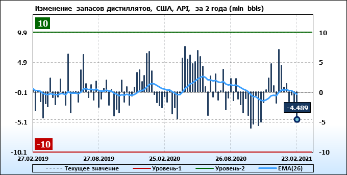Запасы дистиллятов в США по данным института API упали на 4.489 млн. баррелей.