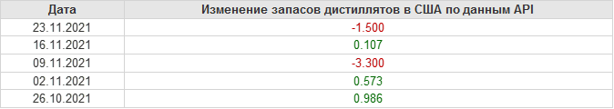 Запасы дистиллятов в США по данным института API упали на 1.5 млн. баррелей.