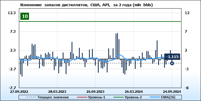 Запасы дистиллятов в США по данным института API упали на 1.115 млн. баррелей.