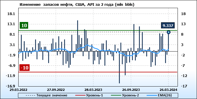 Коммерческие запасы нефти в США по данным института API выросли на 9.337 млн. баррелей.