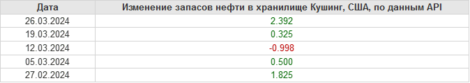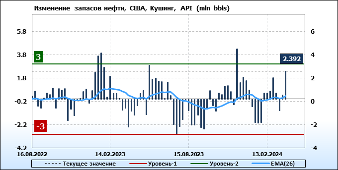 Запасы в хранилище Кушинг по данным института API выросли на 2.392 млн. баррелей.