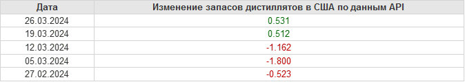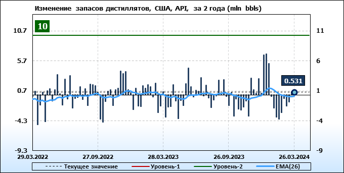 Запасы дистиллятов в США по данным института API выросли на 0.531 млн. баррелей.