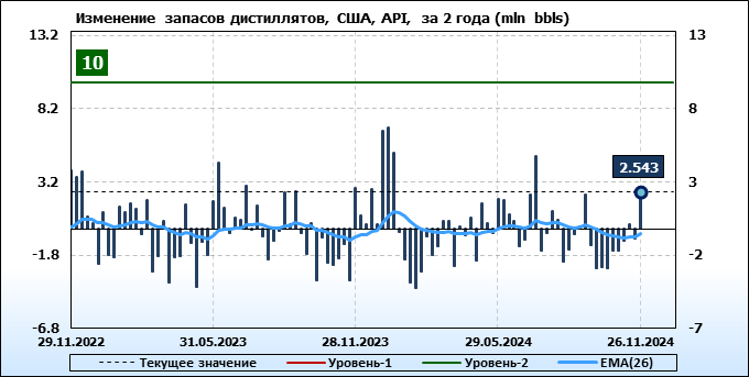 Запасы дистиллятов в США по данным института API выросли на 2.543 млн. баррелей.