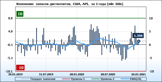Запасы дистиллятов в США по данным института API выросли на 1.398 млн. баррелей.