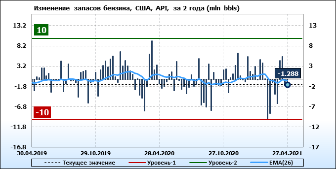 Запасы бензина в США по данным института API упали на 1.288 млн. баррелей.
