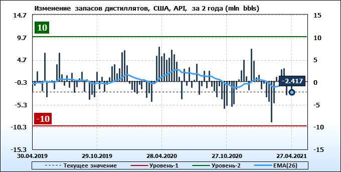 Запасы дистиллятов в США по данным института API упали на 2.417 млн. баррелей.