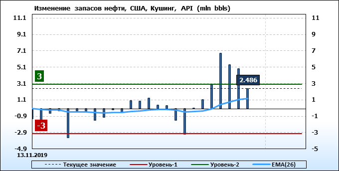 Запасы в хранилище Кушинг по данным института API выросли на 2.486 млн. баррелей.