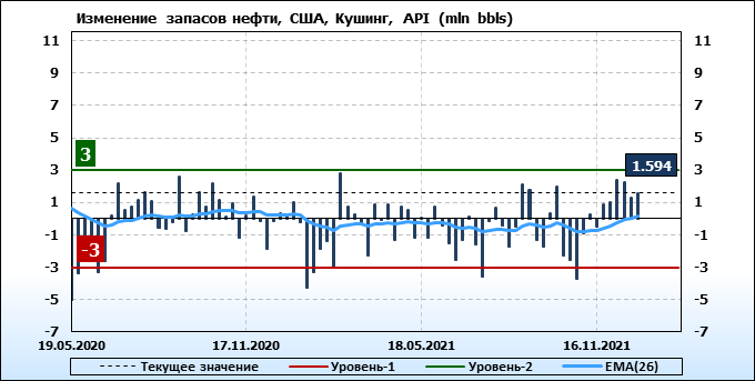 Запасы в хранилище Кушинг по данным института API выросли на 1.594 млн. баррелей.