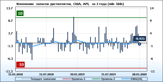 Запасы дистиллятов в США по данным института API упали на -0.421 млн. баррелей.