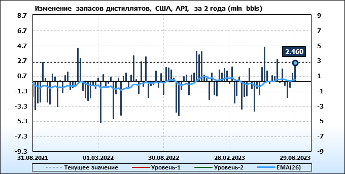 Запасы дистиллятов в США по данным института API выросли на 2.46 млн. баррелей.