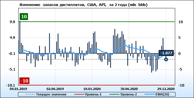 Запасы дистиллятов в США по данным института API упали на 1.877 млн. баррелей.