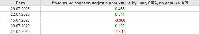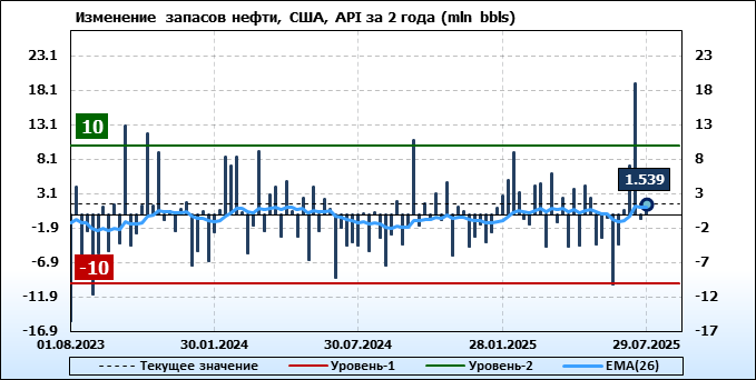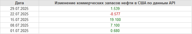 Коммерческие запасы нефти в США по данным института API выросли на 1.539 млн. баррелей, при прогнозе -2.5 млн. баррелей.