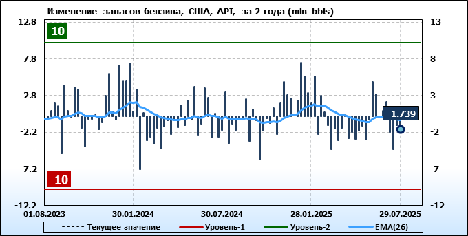 Запасы бензина в США по данным института API упали на 1.739 млн. баррелей.
