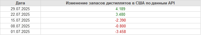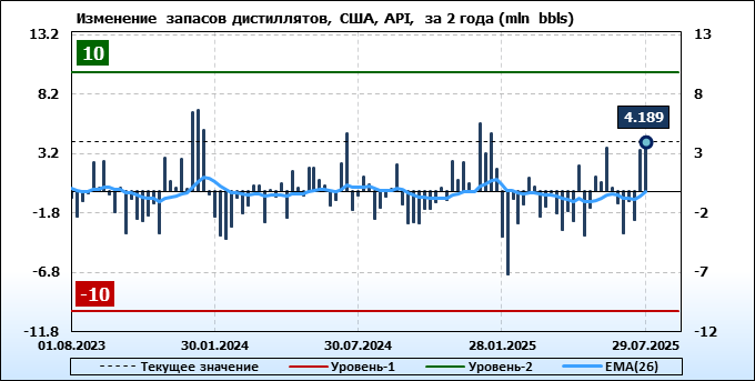 Запасы дистиллятов в США по данным института API выросли на 4.189 млн. баррелей.