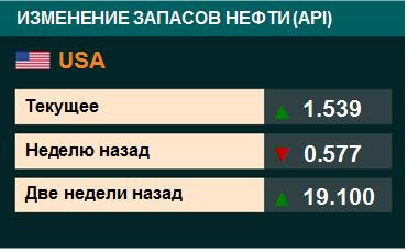 Коммерческие запасы нефти в США по данным института API выросли на 1.539 млн. баррелей, при прогнозе -2.5 млн. баррелей.
