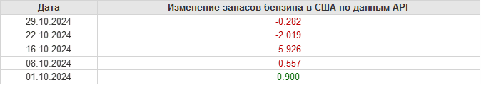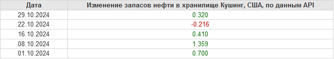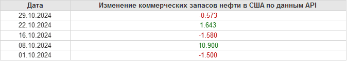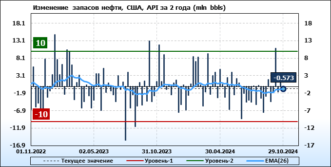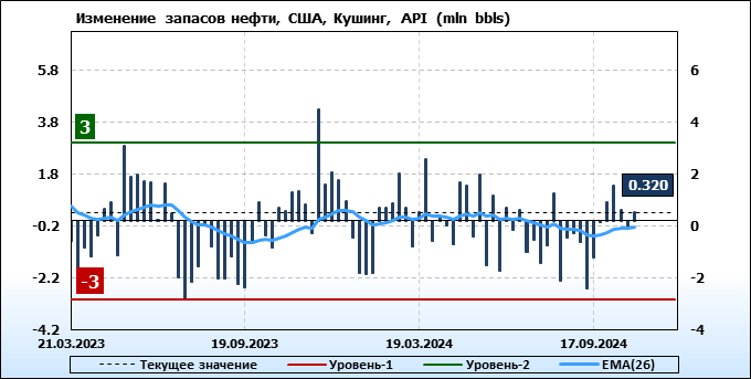 Коммерческие запасы нефти в США по данным института API упали на 0.573 млн. баррелей, при прогнозе +2.3 млн. баррелей.