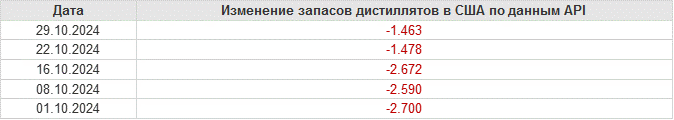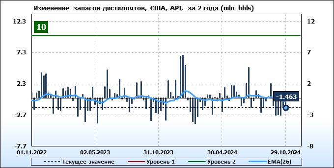 Запасы дистиллятов в США по данным института API упали на 1.463 млн. баррелей.