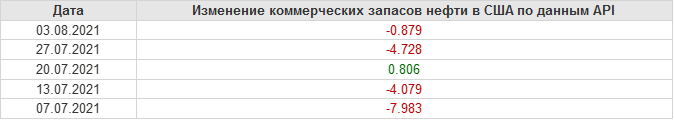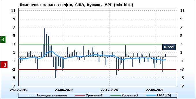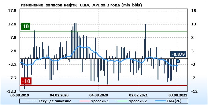 Коммерческие запасы нефти в США по данным института API упали на 0.879 млн. баррелей, при прогнозе -2.9 млн. баррелей.