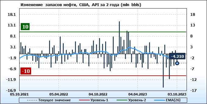 Коммерческие запасы нефти в США по данным института API упали на 4.21 млн. баррелей, при прогнозе -0.092 млн. баррелей.