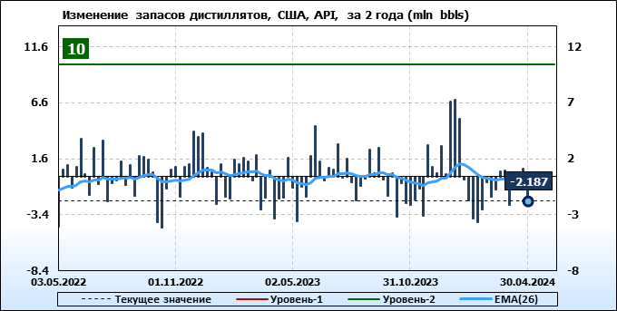 Запасы дистиллятов в США по данным института API упали на 2.187 млн. баррелей.