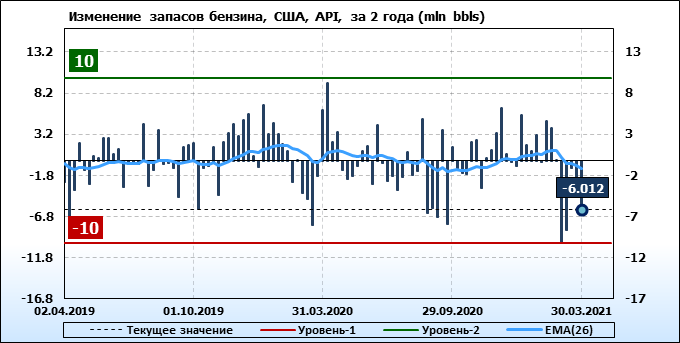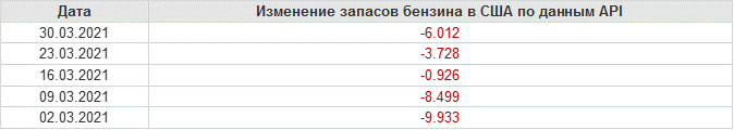 Запасы бензина в США по данным института API упали на 6.012 млн. баррелей.
