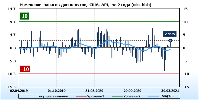 Запасы дистиллятов в США по данным института API выросли на 2.595 млн. баррелей.
