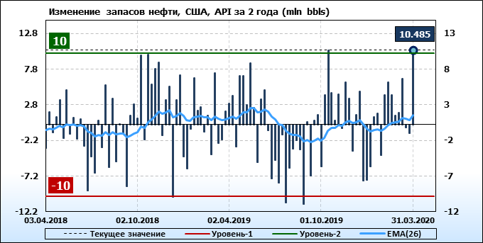 Коммерческие запасы нефти в США по данным института API выросли на 10.485 млн. баррелей.