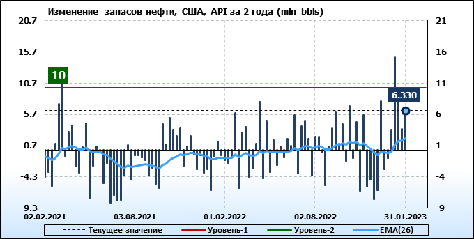 Коммерческие запасы нефти в США по данным института API выросли на 6.33 млн. баррелей, при прогнозе -1 млн. баррелей.