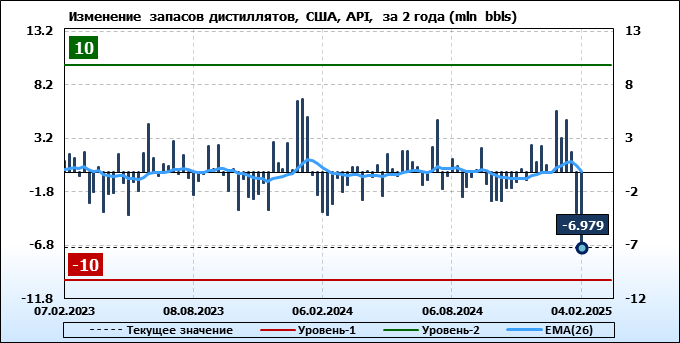 Запасы дистиллятов в США по данным института API упали на 6.979 млн. баррелей.