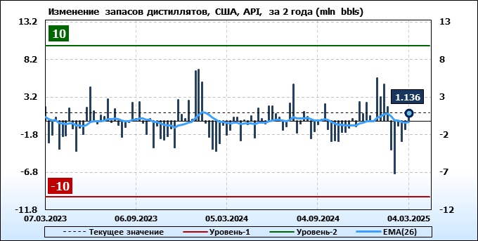 Запасы дистиллятов в США по данным института API выросли на 1.136 млн. баррелей.