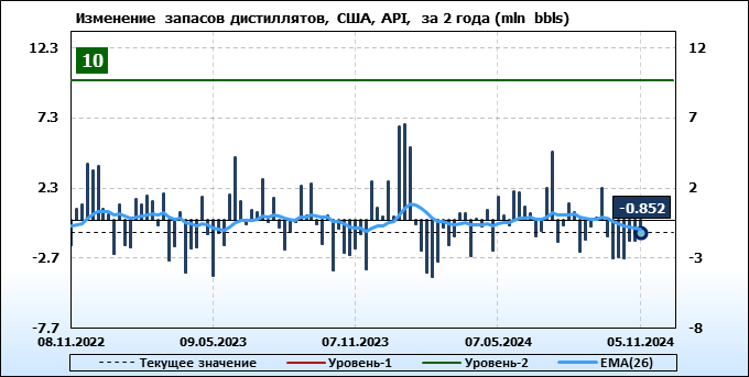 Запасы дистиллятов в США по данным института API упали на 0.852 млн. баррелей.