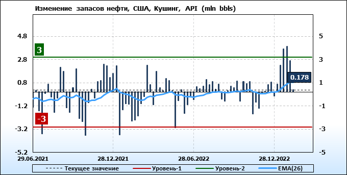 Коммерческие запасы нефти в США по данным института API упали на 2.184 млн. баррелей, при прогнозе +2.15 млн. баррелей.