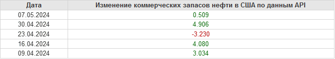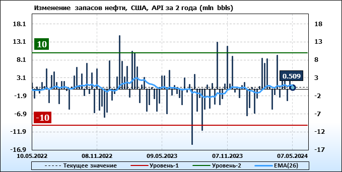 Коммерческие запасы нефти в США по данным института API выросли на 0.509 млн. баррелей, при прогнозе -1.43 млн. баррелей.