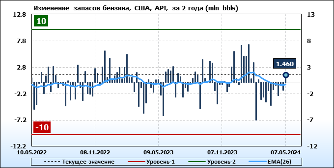 Запасы бензина в США по данным института API выросли на 1.46 млн. баррелей.