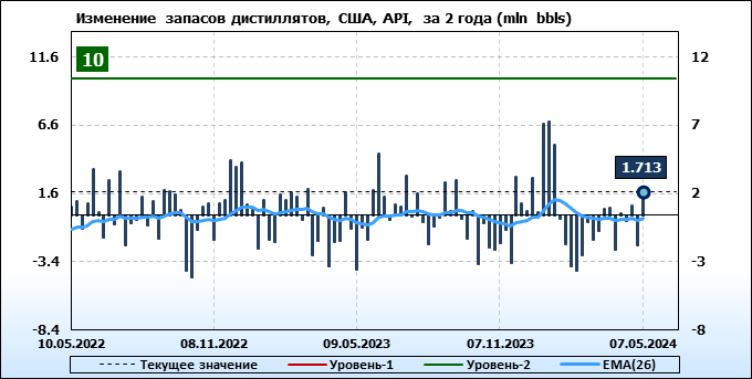 Запасы дистиллятов в США по данным института API выросли на 1.713 млн. баррелей.
