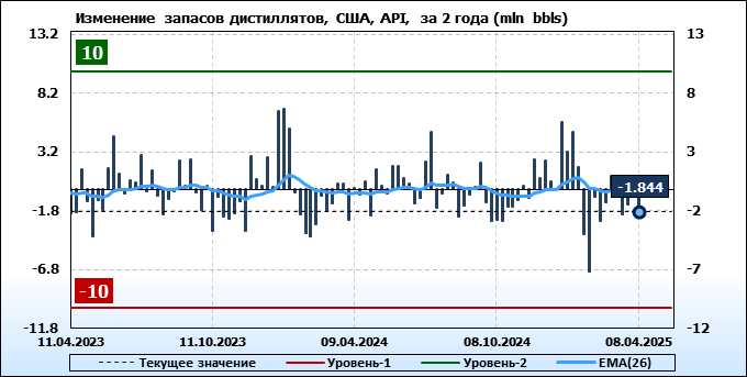 Запасы дистиллятов в США по данным института API упали на 1.844 млн. баррелей.