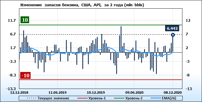 Запасы бензина в США по данным института API выросли на 6.442 млн. баррелей.