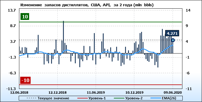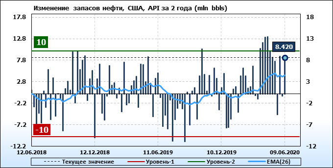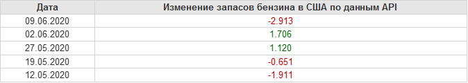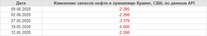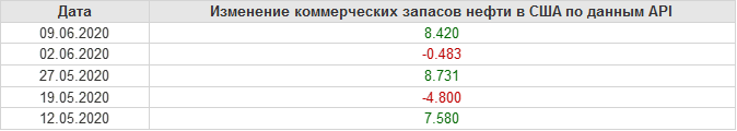 API. Изменение запасов нефти в США на 9 июня 2020