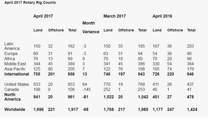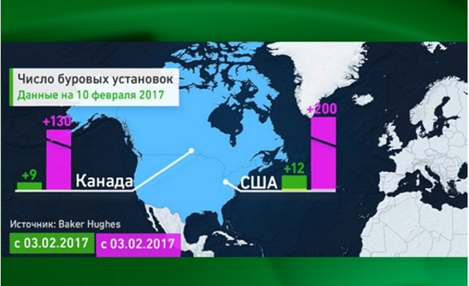 В США количество буровых выросло на 64 единицы, или на 8,11% в месячном выражении, до 853 штук, в годовом выражении — выросло на 416 буровых с 437 в апреле 2016 г. В Канаде показатель сократился на 145, или на 57,3%, с 253 в марте до 108 штук в апреле.