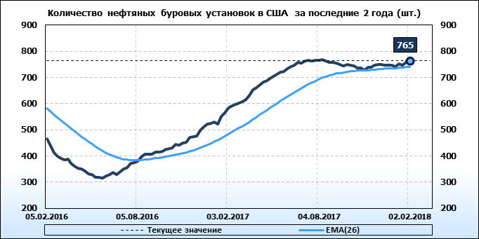 По сообщению Baker Hughes количество нефтяных буровых установок в США на 02.02.2018 составило 765 штук. За неделю количество буровых установок выросло на 6 единиц. За прошедшую неделю не было ни одной установки, которая бы прекратила работу. Количество установок, которые ввели в эксплуатацию составило 6 единиц. Как видим, рост числа установок есть, но он незначительный.