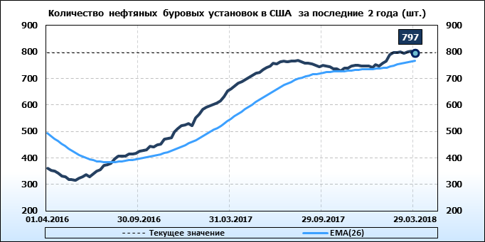 По сообщению Baker Hughes количество нефтяных буровых установок в США на 29.03.2018 составило 797 штук.