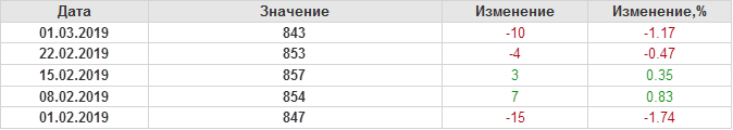 По сообщению Baker Hughes количество нефтяных буровых установок в США на 01.03.19 составило 843 штуки. За неделю количество буровых установок упало на 10 единиц. На прошлой неделе количество установок, которые прекратили работу составило 11 единиц. Количество установок, которые ввели в эксплуатацию составило 1 единицы. По итогам недели наблюдаем существенное сокращение буровых.