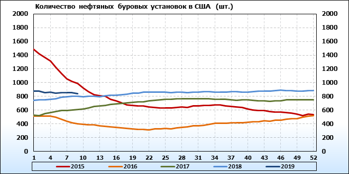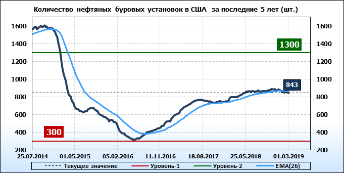 Baker Hughes. Количество буровых установок в США. Данные на 01.03.2019