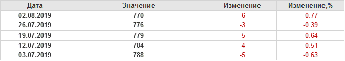 По сообщению Baker Hughes количество нефтяных буровых установок в США на 02.08.19 составило 770 штук. За неделю количество буровых установок упало на 6 единиц. На прошлой неделе количество установок, которые прекратили работу составило 6 единиц. В течение прошедшей недели ни одна установка в строй не вводилась. Видим, что по итогам недели падение числа установок незначительное.