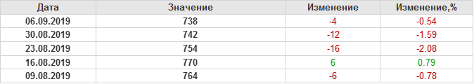 По сообщению Baker Hughes количество нефтяных буровых установок в США на 06.09.19 составило 738 штук. За неделю количество буровых установок упало на 4 единицы. На прошлой неделе количество установок, которые прекратили работу составило 8 единиц. Количество установок, которые ввели в эксплуатацию составило 4 единицы. Видим, что по итогам недели падение числа установок незначительное.