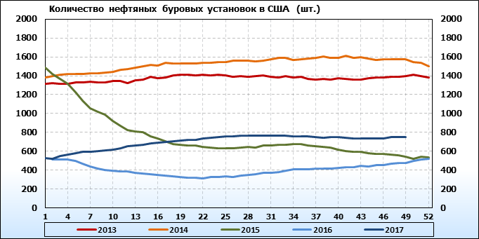 По сообщению Baker Hughes количество нефтяных буровых установок в США на 08.12.2017 составило 751 штука. За неделю количество буровых установок выросло на 2 единицы. На прошлой неделе количество установок, которые прекратили работу составило 6 единиц. Количество установок, которые ввели в эксплуатацию составило 8 единиц. Как видим, рост числа установок есть, но он незначительный.