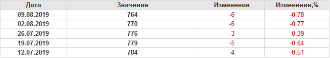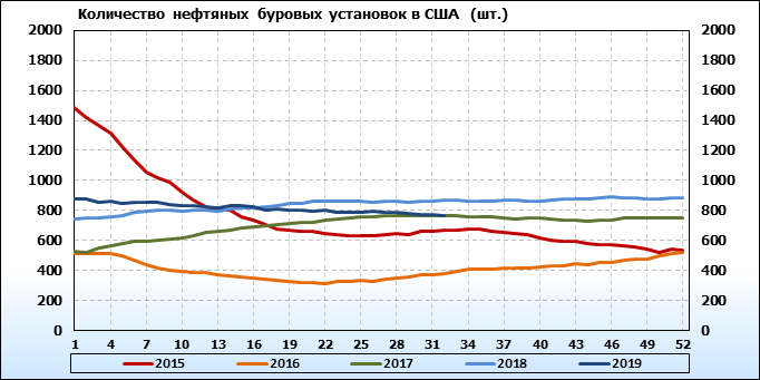 По сообщению Baker Hughes количество нефтяных буровых установок в США на 09.08.19 составило 764 штуки. За неделю количество буровых установок упало на 6 единиц. На прошлой неделе количество установок, которые прекратили работу составило 9 единиц. Количество установок, которые ввели в эксплуатацию составило 3 единицы. Видим, что по итогам недели падение числа установок незначительное.