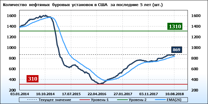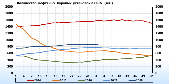 Baker Hughes. Количество буровых установок в США. Данные на 10.08.2018