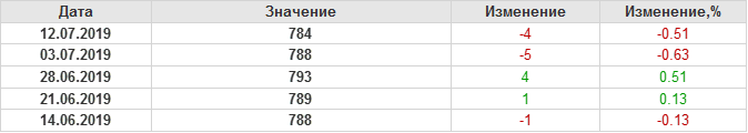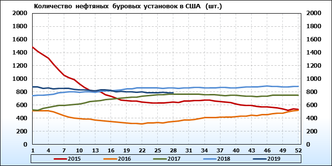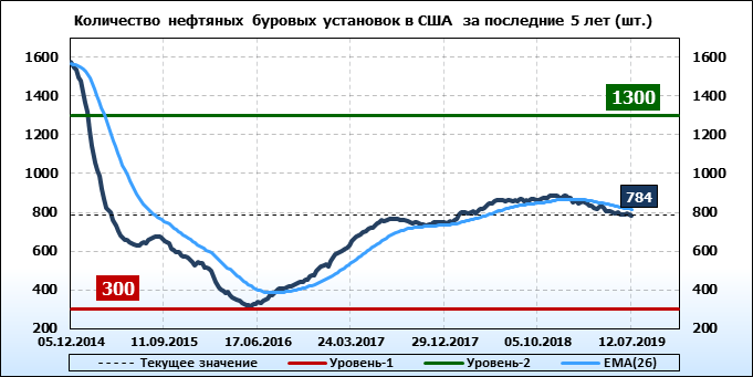 По сообщению Baker Hughes количество нефтяных буровых установок в США на 12.07.19 составило 784 штуки. За неделю количество буровых установок упало на 4 единицы. На прошлой неделе количество установок, которые прекратили работу составило 10 единиц. Количество установок, которые ввели в эксплуатацию составило 6 единиц. Видим, что по итогам недели падение числа установок незначительное.