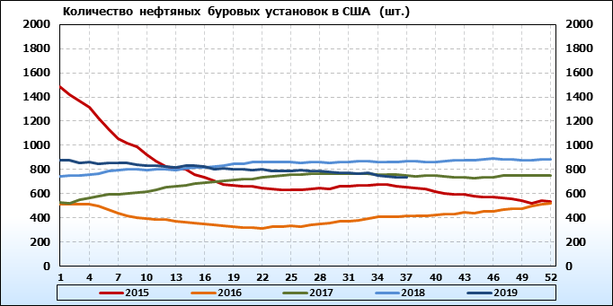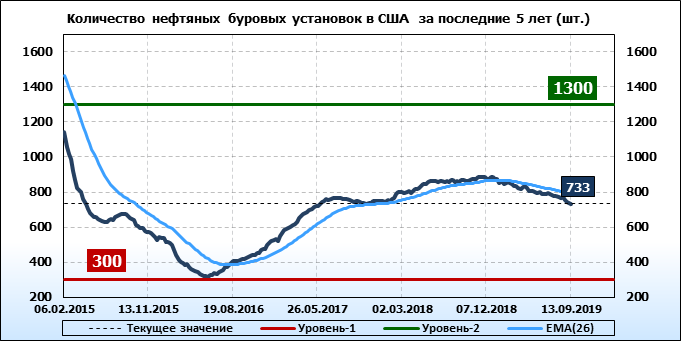 По сообщению Baker Hughes количество нефтяных буровых установок в США на 13.09.19 составило 733 штуки. За неделю количество буровых установок упало на 5 единиц. На прошлой неделе количество установок, которые прекратили работу составило 14 единиц. Количество установок, которые ввели в эксплуатацию составило 9 единиц. Видим, что по итогам недели падение числа установок незначительное.